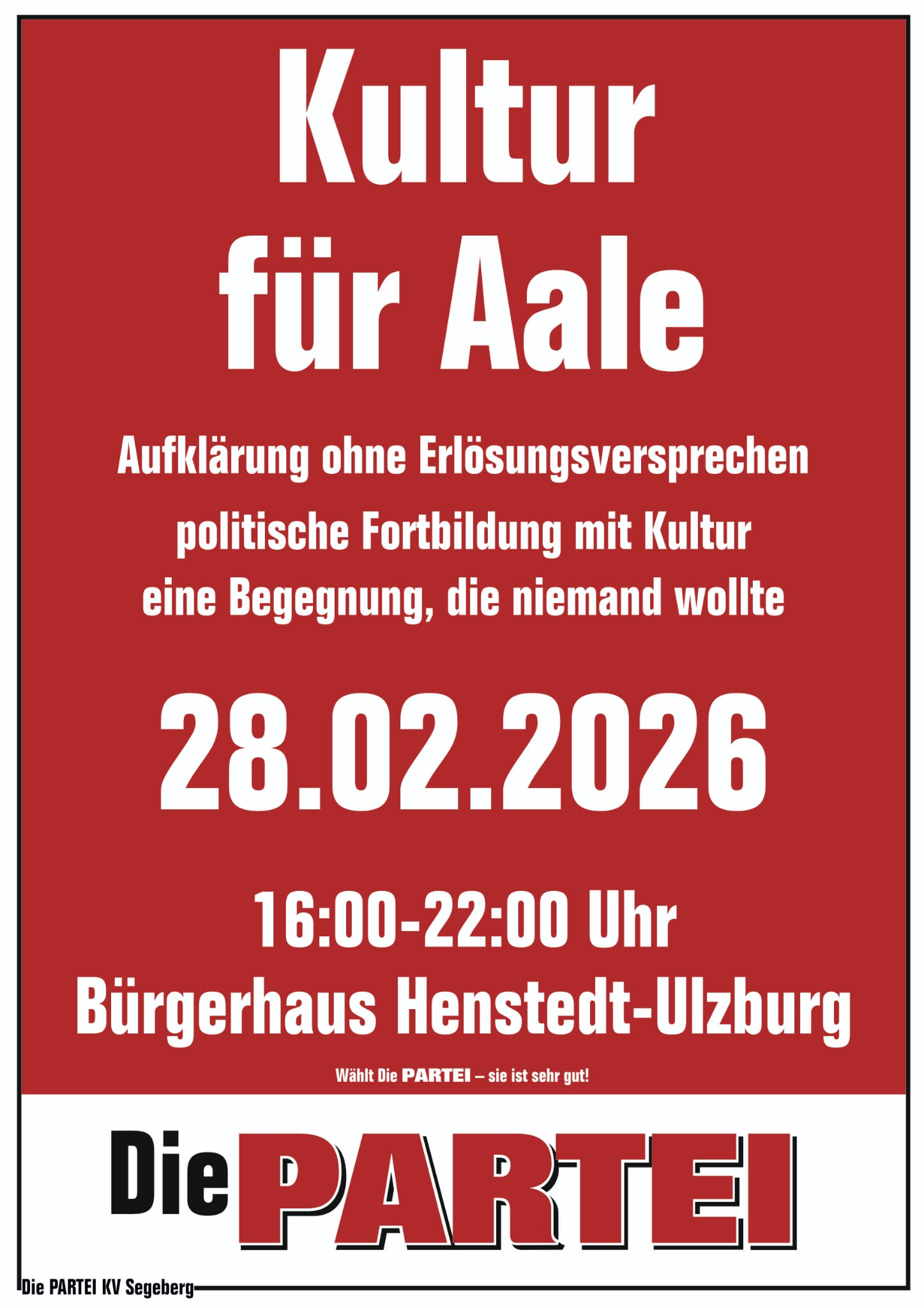 Kultur für Aale – Aufklärung ohne Erlösungsversprechen (dafür mit Hinterzimmer). Dieser Einladung kommen wir gerne nach und reisen am 28.2.2026 nach Henstedt-Ulzburg.