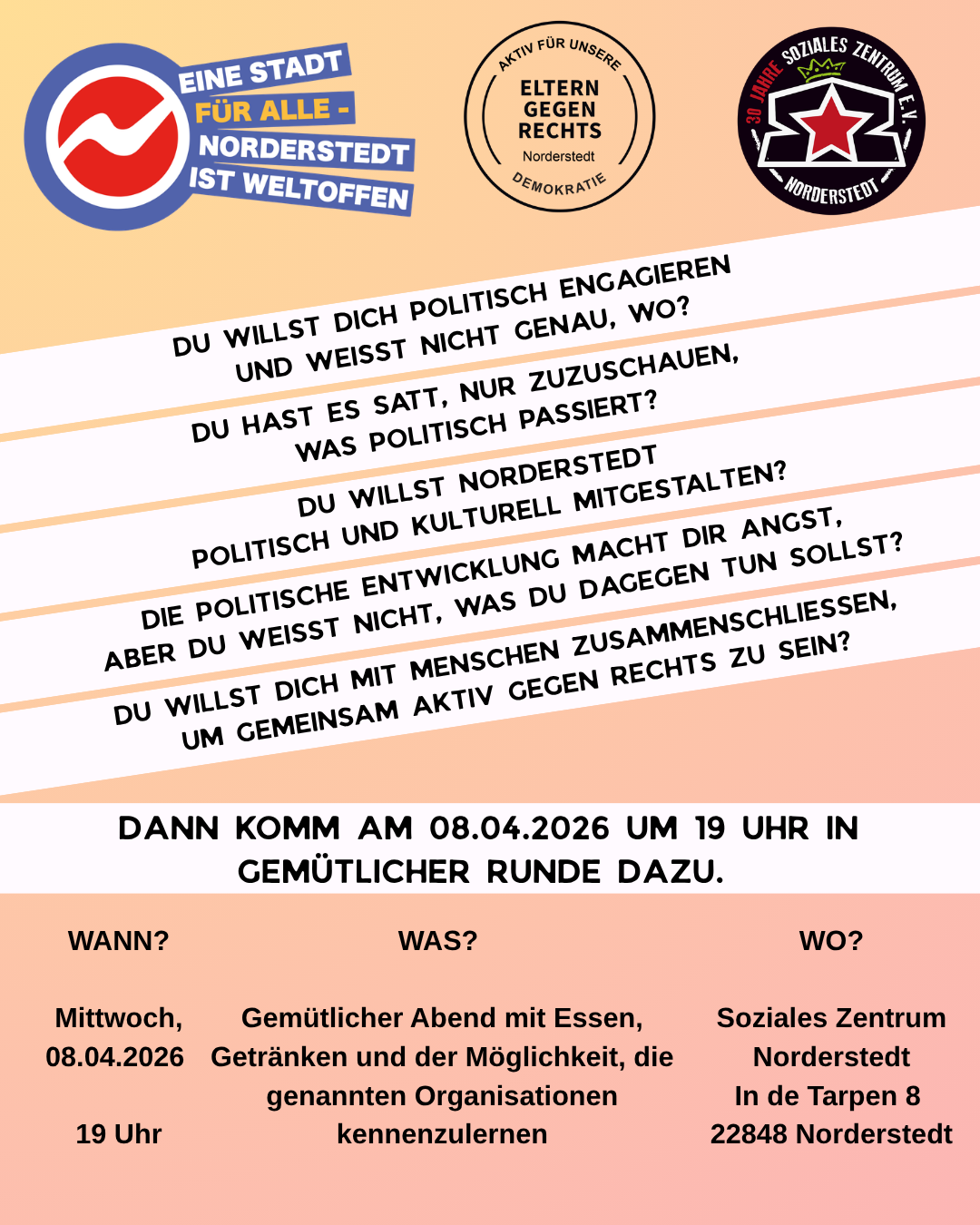 Was? Gemütlicher Abend mit Essen, Getränken und die Möglichkeit, Norderstedt ist weltoffen – Eltern gegen Rechts – Soziales Zentrum kennenzulernen!